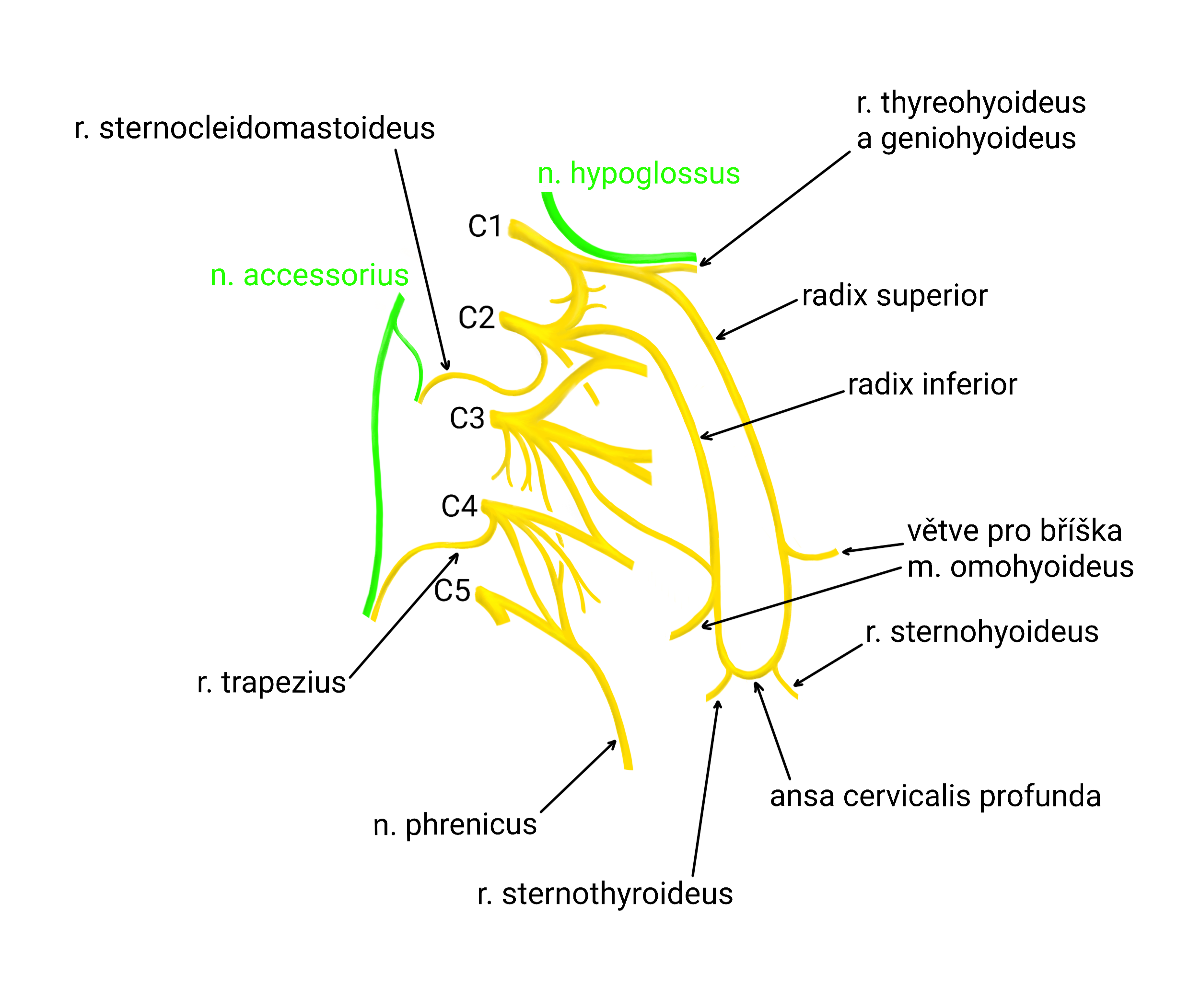 - při jeho odstupu se k radix superior přidává nervus hypoglossus (motorická nervová vlákna z C1 se tak dostávají k poslednímu infrahyoidnímu svalu - m. thyreohyoideus, a k m. geniohyoideus) - Radix inferior ansae (C2-C3) - r. ventris inferioris m. omohyoidei
